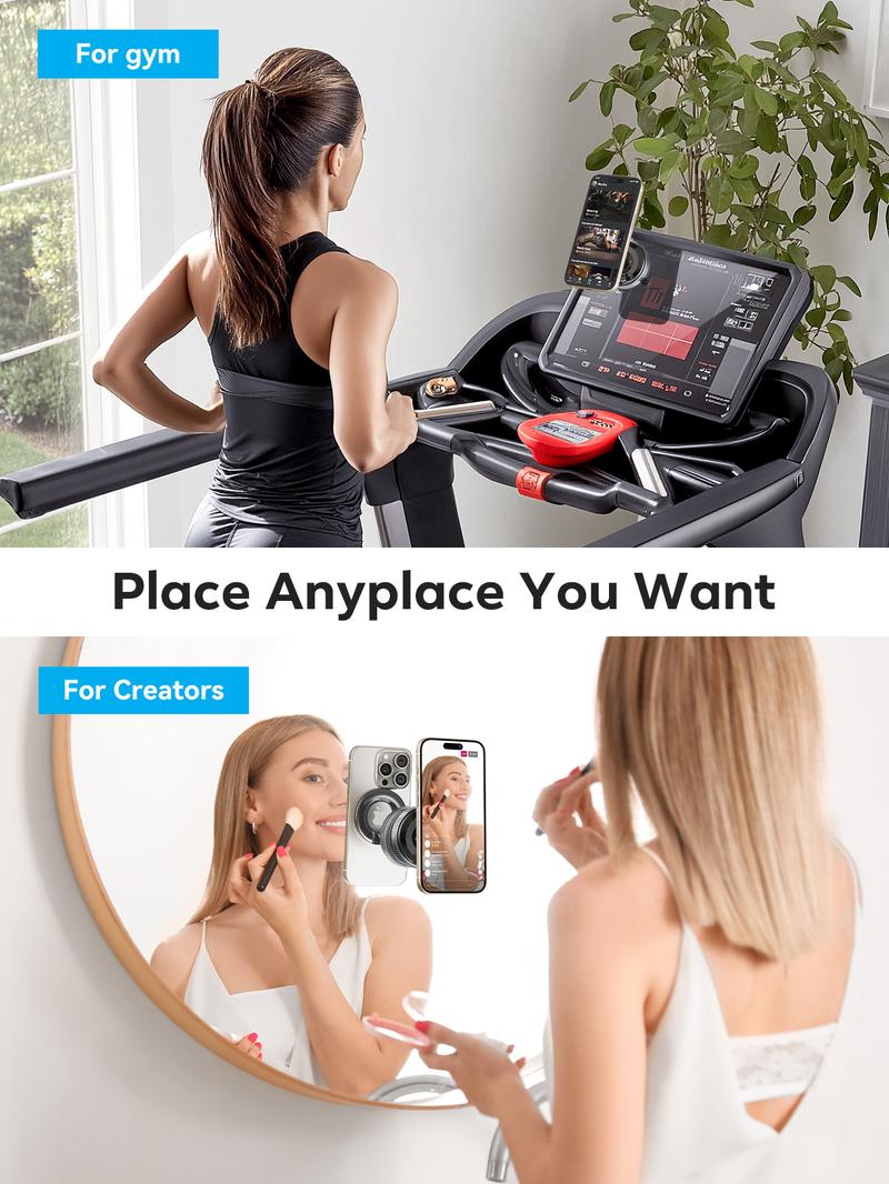 Combining vacuum suction and magnetic strength, this versatile phone mount securely sticks to a wide range of smooth surfaces, including mirrors, glass, screens. Content creators will also find it perfect for hands-free filming and vlogging.